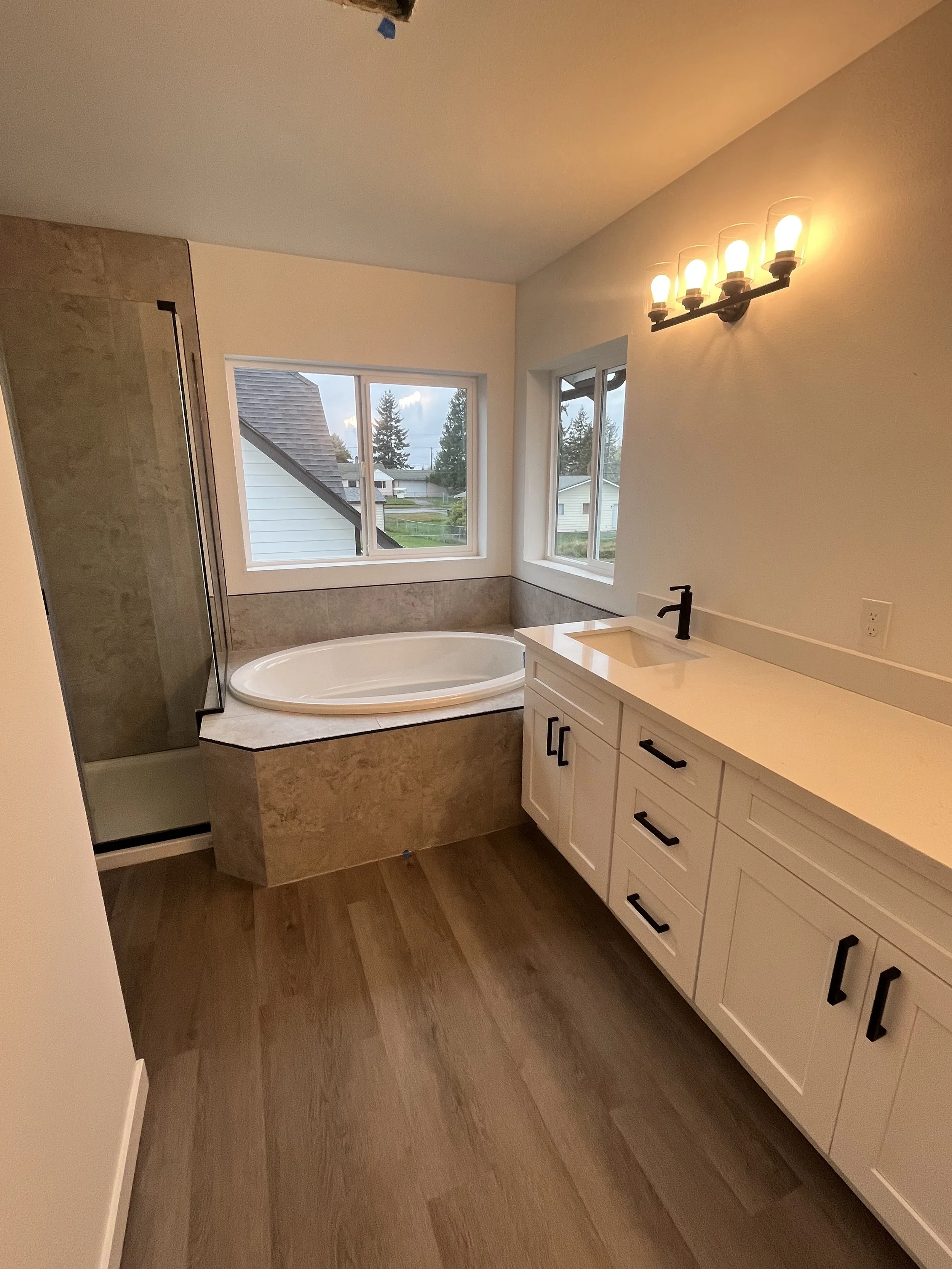 Coming available soon is this brand new, luxury, custom built home in South Tacoma. This home boasts vaulted ceilings adding spaciousness and an open airy feeling to the space. The main floor features two family rooms, one with an electric fireplace, bedroom and 3/4 bathroom and luxury vinyl plank throughout the common areas. The kitchen is open into the family room, perfect for entertaining and features a gorgeous island, stainless steel appliances and more! Upstairs are 3 more bedrooms with the primary featuring a full bathroom with separate soaker tub and shower and a full bathroom in the hallway. The back area is open and features a detached garage with ADU above for a separate $1650.00.